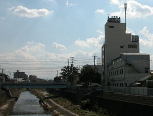 もう少し近付いてみます。てっぺんにニシモトと書いてあるのが見えます。この建物の向こう側のカドを右へ回ると |
