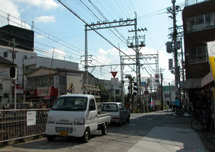 改札を出てすぐ踏切があります。この道を線路ぞいに行くとスーパーがありますが、もうひとつわかりやすい道をご案内致します。踏切の前迄行って右手を見て下さい。 |