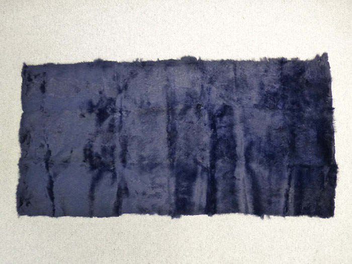 ラビット長毛プレートを青赤染めした在庫です。毛は長く手触りは良いですが、湿気で色落ちがします。洗ってみるなどすれば使えるかも知れません。色が写りますのでご了承の上お求め下さい。特価で1枚限り